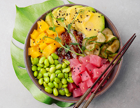Основа на выбор, тунец, соус терияки, авокадо, персик, огурец понзу, бобы эдамамэ, кунжут, бульон вок, кунжутное масло