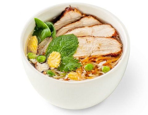 Лапша и мясо на выбор, бульон куриный, масло кунжутное, мини кукуруза, морковь, яйцо маринованное, бобы эдомаме, петрушка, базилик, мята, соевые ростки, лук репчатый, кунжут, соевая паста