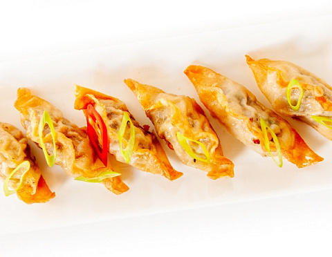 Японские пельмени из тонкого теста в форме полумесяца с длинными ушками начинкой на выбор и соусом для гёдза.