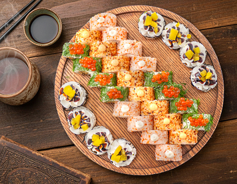 1.Морской окунь темпура, японский омлет, грибы, соус Спайси, сливочный сыр, такуан, соус Терияки 2.Сурими, сливочный сыр, майонез, икра масаго 3.Мидии обжареные в соусе, сливочный сыр, укроп, икра лососевая имитация, такуан 4.Грибы шиитаке, сливочный сыр, лук зеленый, кунжут Кимчи, соус Спайси Производитель: ООО "Глобалпрогрупп"