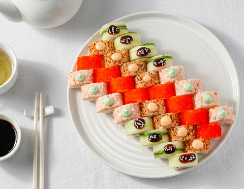 1.Креветка в темпуре, сливочный сыр, огурец, соус Терияки, кунжут белый 2.Сурими, масаго, мидии, сливочный сыр, салат Айсберг, лук зеленый, крем Васаби 3.Крабовые палочки, икра масаго, майонез, огурец, авокадо 4.Грибы шиитаке, сливочный сыр, лук зеленый, кунжут Кимчи, соус Спайси Производитель: ООО "Глобалпрогрупп"
