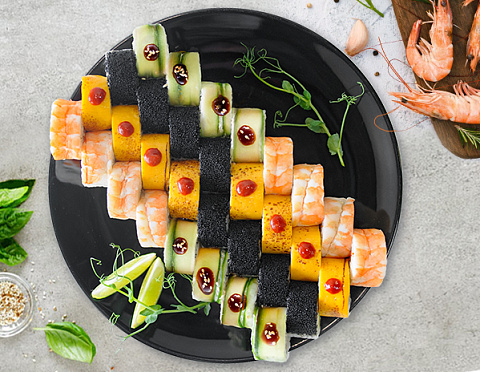 Ролл в Тобике со сливочным сыром, лососем, креветкой и авокадо,