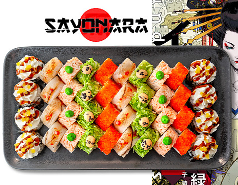 Окунь темпура, японский омлет, грибы, соус Спайси, сливочный сыр, такуан, соус Терияки.