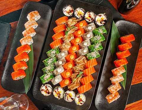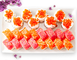 Ролл в морских водорослях с лососем, сливочным сыром и Ореховым соусом,