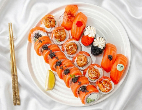 Ролл с лососем, креветкой, творожным сыром, авокадо, соусом терияки и кунжутом