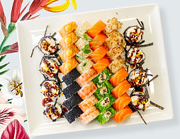 Ролл с морским окунем темпура, японским омлетом, грибами, соусом Спайси, такуаном, сливочным сыром и соусом Терияки.