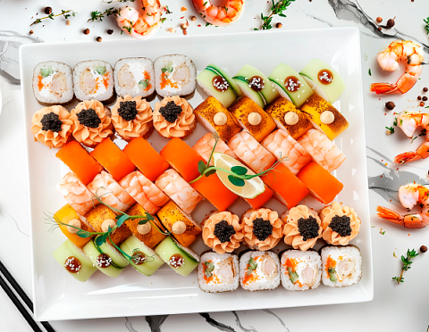 Креветка темура, огурец, сливочный сыр, сыр чеддер, соус гриль
