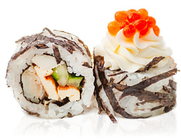 Пряный сыр, креветка в темпуре, салат айсберг, огурец, кунжут ким-чи, икра осетровая имитация