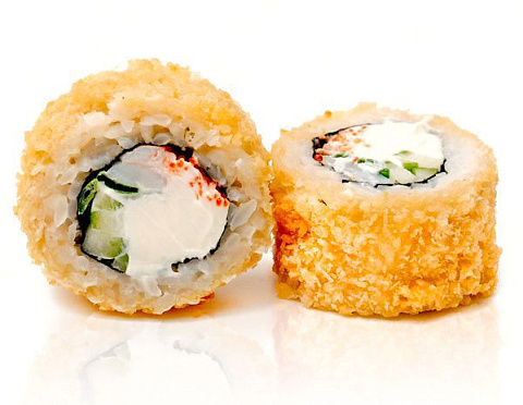 Крабмикс, сыр Чеддер, огурец, чипсы бекона, сливочный сыр, соус Терияки, рис, кляр, сухари Панко