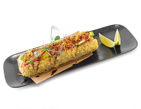 Тунец, авокадо, сливочный сыр, кунжутное масло, картофель Пай, соус Терияки, кляр, сухари Панко.