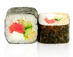 Копченый лосось, морской окунь, огурец, перец сладкий, салат, сливочный сыр, майонез, икра летучей рыбы, соус Терияки