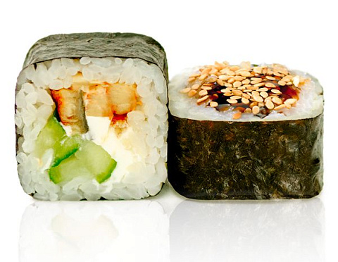 Угорь, огурец, сливочный сыр, соус Унаги, кунжут белый.