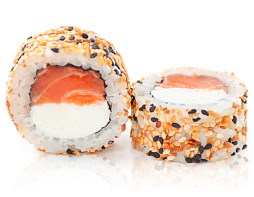 Креветка в темпуре, сливочный сыр, огурец, соус Терияки, кунжут белый.