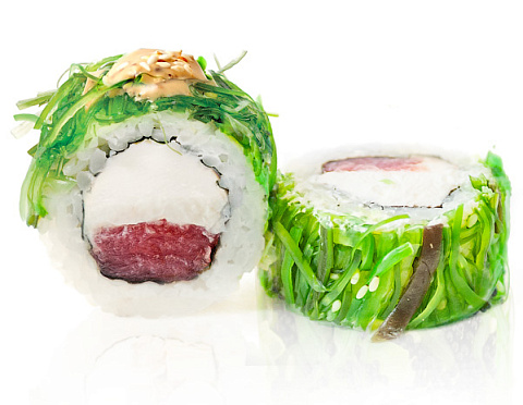 Тунец, сливочный сыр, водоросли маринованные, соус Ореховый, кунжут белый.