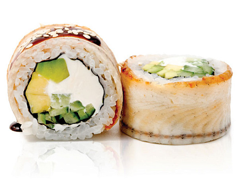 Угорь, огурец, сливочный сыр, авокадо, соус Унаги, кунжут белый.