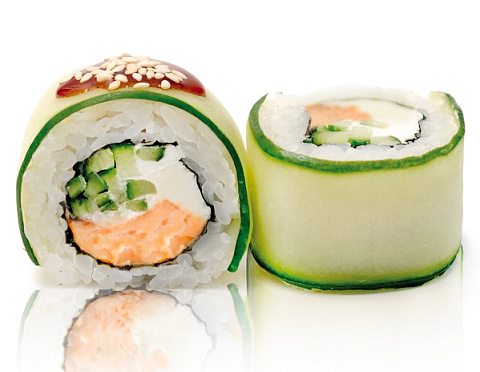 Лосось жареный в соусе Терияки, сливочный сыр, огурец, соус Спайси