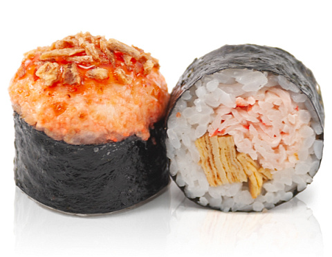 Сурими, японский омлет тамаго, сырная шапка, соус чили сладкий, кранч лук