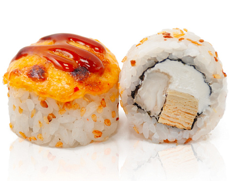 Сурими, японский омлет тамаго, сырная шапка, соус чили сладкий, кранч лук