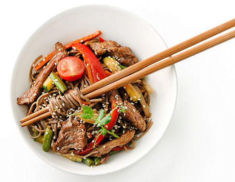 Вырезка говяжья, цукини, лук красный, морковь, перец болгарский, масло чесночное, лапша гречневая, бульон вок, соус вок, кунжут белый, ростки соевые
