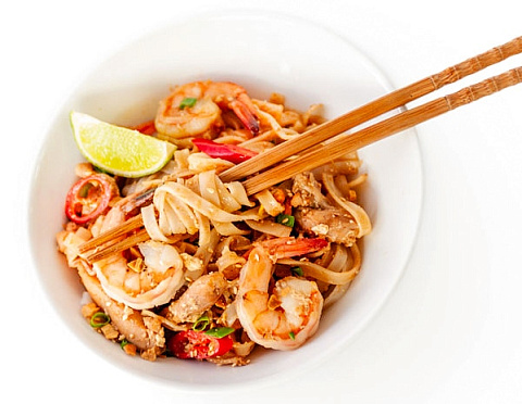 Рисовая лапша, куриное бедро, креветки, яйцо, сыр тофу, морковь, соевые ростки, арахис, кунжут, лук зеленый, перец Чили, лайм, соус Пад Тай.