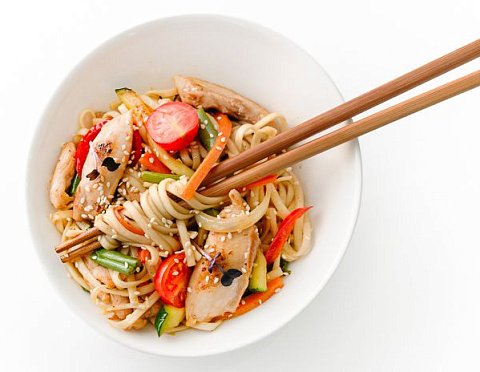 Курица, цукини, лук красный, морковь, перец болгарский, масло чесночное, лапша пшеничная, бульон вок, соус вок, кунжут белый, ростки соевые